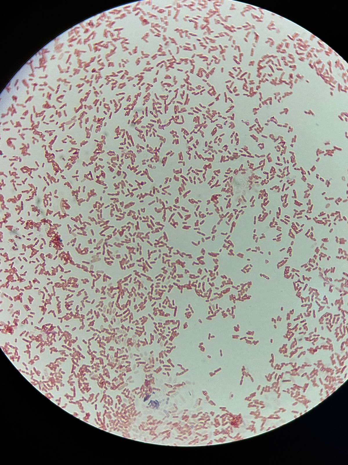 Se ha obtenido un resultado negativo, ya que no se pudo ver ninguna Gram negativa (color rojizo) y solo se pudieron observar Gram positivas (color azulado). Se ha añadido una foto de cómo debería haberse visto la tinción. Debajo de esa foto sale como debería haberse visto la Escherichia coli al microscopio.